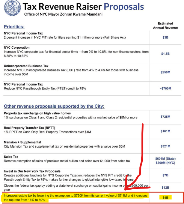 🚨纽约市长、社会主义者佐兰·马姆达尼提议将遗产税的免税额从710万美元降至75万美元。 他还提议将遗产税税率从16%提高到50%。 美国其他任何司法管辖区都不会在遗产如此之少的情况下就没收个人的财产。任何在纽约市拥有房产的人,其房产净值都可能超过75万美元,从而不得不缴纳遗产税。 联邦遗产税(死亡税)适用于超过1500万美元的个人遗产。但是,在缴纳联邦遗产税之前,可以扣除其他州和市的遗产税。因此,实际上,马姆达尼阻止了联邦政府对遗产征税,纽约市和纽约州抢先一步征收了所有税款。 关注:@WallStreetMav