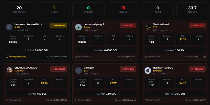 @pumpmarketfun 的 memecoin 预测市场看起来很有意思,基本上就是预测 @Pumpfun 的代币能否在 1 小时内完成升级。 如果你查看结算页面,会发现 20 个市场已经结算,其中 19 个市场表现不佳,没有一个在 1 小时内完成升级。这意味着 95% 的失败率。 几乎没有代币能在 60 分钟内获得足够的关注度完成升级。 大多数交易者都涌向“否”选项,但由于大家的想法都一样,所以“否”选项的利润很低。
