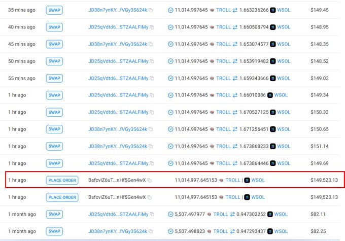 有人正在出售价值 149.5 万美元的 $troll,用于SOL 这款钱包每5分钟售出148.32美元。 钱包地址:BsfcviZ6uTZiwR5KxzGVfMjLCFwQwwaJSunHf5Gen4wX