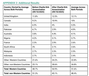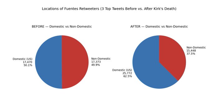 更奇怪的是:富恩特斯最热门的贴文被大量外国帐号转发,包括印度、巴基斯坦、奈及利亚、马来西亚和印尼。这些国家与富恩特斯以美国为中心的认同政治毫无关联。但它们恰好位于一些被广泛用于低成本用户农场的地区。