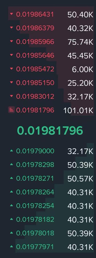 这种深度的挂单,应该证明庄家还在吧? 因为没庄家的,一般深度没这么好,而且不会在价格这么紧凑的位置挂这么多单子。 比如0.0198之上可能就是0.02,0.021,而且单子可能只有几十,几百个代币的挂单。 既然庄家还在,能否爆拉一下? 反正都上了BN合约的,你多空都能赚钱,拉一下又怎么了?