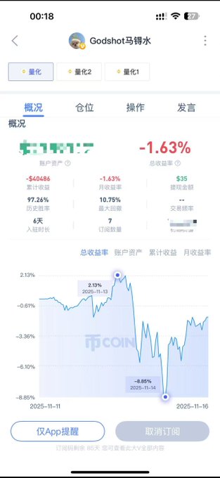 大饼106000开的机,随后大饼单边下跌11%左右,接的大账户量化最大回撤10%,但是随着大饼的反弹目前账户回撤缩减至负1.6%,另外一个账户不但收复了回撤并创下新高。