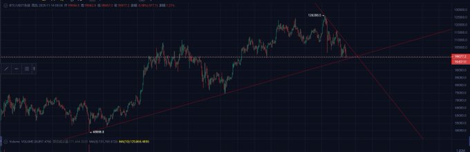 目前大饼98000附近的支撑位置还挺重要的,如果这个位置守不住,向下可能要跌很大一段了。