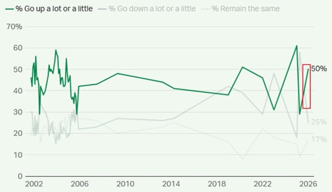 股市Optimism正在升温,一半的美国人预计未来六个月物价将会上涨。 尽管经济担忧加剧,但市场情绪依然强劲,这表明预期与现实之间存在明显差距。