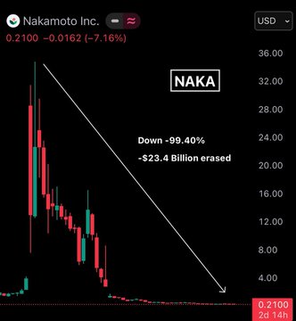 比特币财资公司 Nakamoto $NAKA 在不到一年的时间里市值暴跌 99.30%,从 240 亿美元的峰值跌至仅 1.8 亿美元,市值蒸发了 233 亿美元。