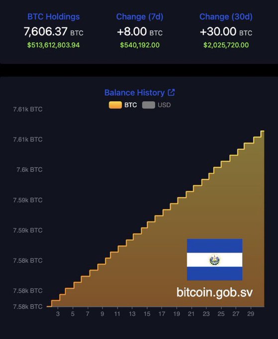 最新消息:🇸🇻 萨尔瓦多继续购买比特币,目前持有 7,606.37 BTC 🚀