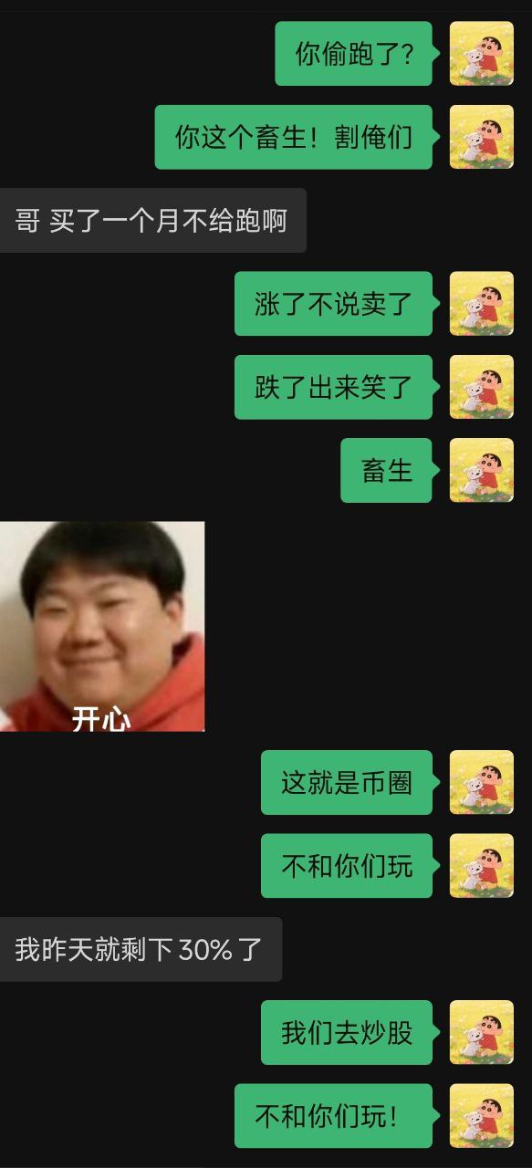但我也不会加仓,筹码结构上大多数都是提前埋伏的,涨不起来确实我不会怪币安,就类似聊的记录,跌下来最大的问题是因为赚的人砸呀,但赚钱了为什么不砸?这也说不过去呀 昨天吃饭朋友和我说,硬要怪币安,那就是为什么自己泄露这消息给别人埋伏。那也怪自己我们为何没这内幕,混的不行呗。然后我们笑笑就开始聊股票该继续怎么搞 选择大于努力,万一努力了没有结果就算了。心态一定要好