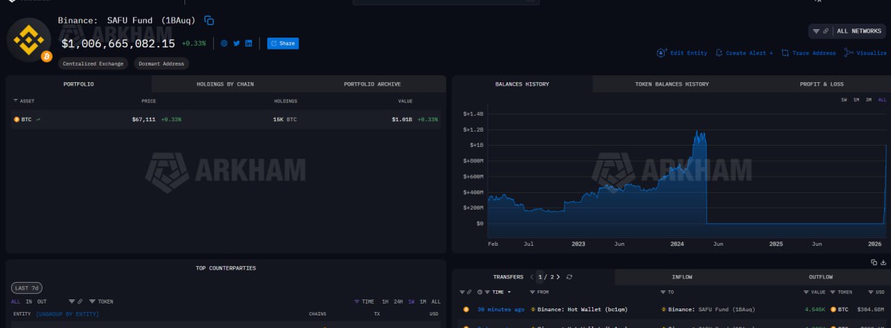 币安SAFU基金已募集大饼。 然而,大饼的价格仍处于下降趋势。 intel.arkm.com/explorer/addres...