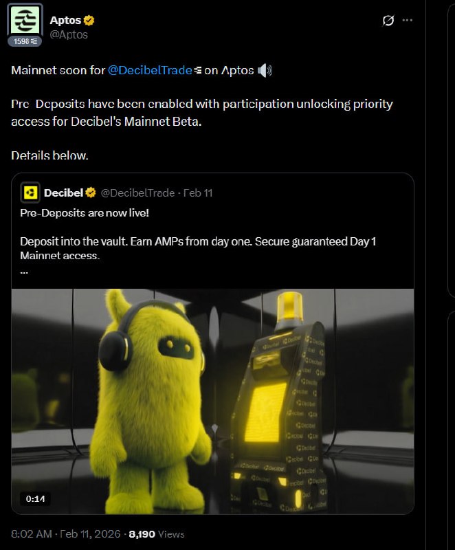 空投优惠:分贝 Decibel 是一款综合性的链上交易工具,旨在提供现货、期貨和收益交易机会。使用 Decibel,即可在链上公开交易。 Decibel 目前正在接受预付款。参与预付款计划,您将获得: • 分贝分数 第0季 • 根据您在预充值队列中的位置,您将在上线时优先获得 Decibel借贷池(DLP) 的使用权。 • 活动结束后,您将获得额外的 USDC 奖励,该奖励将计入您的交易余额。 • 提前获得主网访问权限 指示: 1️⃣ 访问:app.decibel.trade/r/donglaocho... 并连接您的钱包(您可以使用 OKX 钱包,然后将 USDC提取到Aptos网络) 2️⃣ 点击存款并选择您要存入的金额:最低 50 美元 3️⃣ 等待接收您的分数
