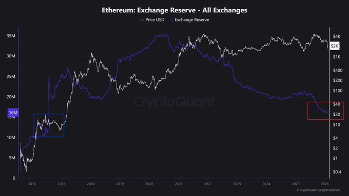 目前交易所中可用的ETH数量已达到10年来的最高水平 供应正在减少🤯