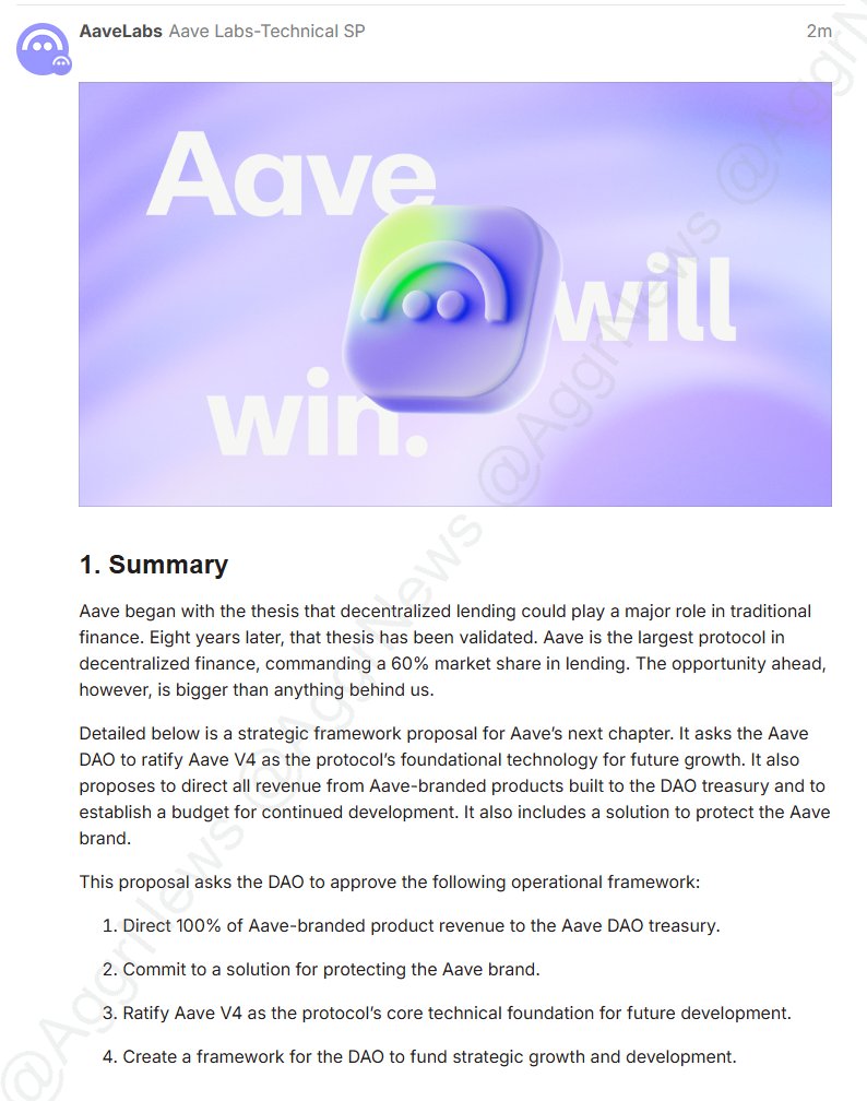 Aave Labs 提议将 100% 的产品利润转移至 DAO 金库,并请求获得价值 2500 万美元的稳定币和 75,000 个 AAVE 代币,同时建议该基金会保留品牌商标。 x.com/AggrNews/status/20220245...