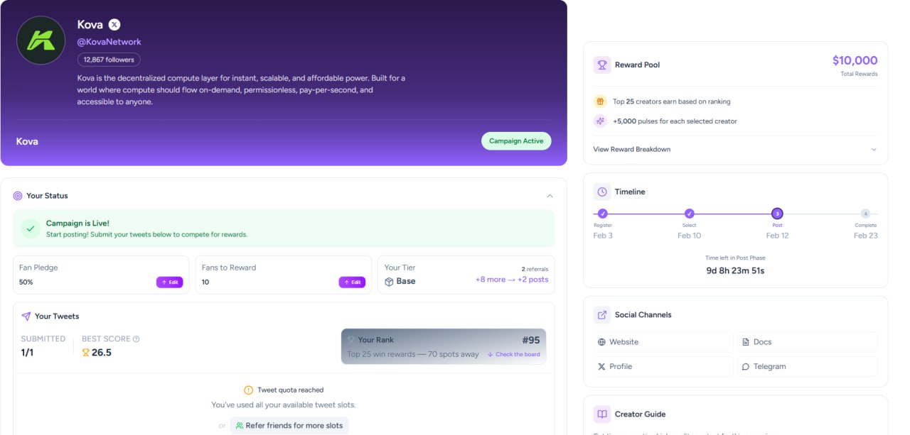 1️⃣2️⃣3️⃣4️⃣5️⃣ 📣 InfoFi 粉丝团活动仍在进行中 💵 总空投:$10,000 USDC ⏰ ~ 2月23日(周一) 1️⃣ 新粉丝团成员注册 推荐码 🔗 KIOWN302 2️⃣ 在 KovaNetwork 上发布 CK 的推文,即可获得 50% 奖励 ☄️ 您可以获得我 50% 的奖励,快来参与并赢取奖励吧! InfoFi 仍然可用! InfoFi 支持平台 🧐 Wallchain 🧐 Mindo