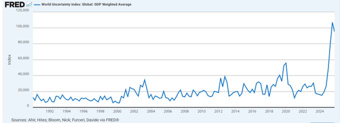 “世界不确定性指数”是宏观经济学中最大的骗局吗?🤡 这个指数实际上只是统计“不确定”这个词在报告中出现的次数。批评者称之为“数字废话”……说白了,现在的互联网比2001年更擅长抱怨了。但是……如果每个人都因为“指数”高而不敢消费,那么经济衰退最终还是会到来。这是一种自我实现的预言。♾ 世界真的要毁灭了吗?还是我们只是陷入了无休止的负面新闻循环中?