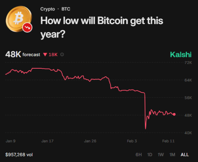 🐋巨鲸鲸:Kalshi 鲸鱼们押注 $BTC 暴跌至 48,000 美元。 市场情绪比我预期的更快地跌至“投降线”。这会是最终的陷阱,还是长达数月的寒冬的开始? 如果你打算逢低买入,就写下“HODL”;如果你认为卡尔希的观点是正确的,就写下“down”。