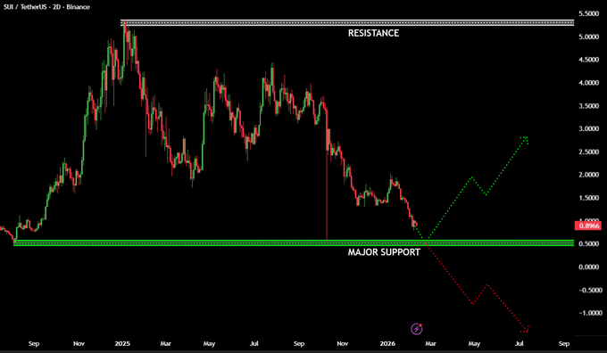 🐋 巨鲸 WATCH: $SUI 目前正在提供市场结构方面的大师级课程。 我们已经从 5 美元的阻力位一路回落到基础位置。看看图表——我们正在接近 2024 年那轮上涨行情的起始点位。 两种情况: 1. 干净俐落的反弹和趋势反转(绿色路径)。 2. 失去支持会导致「最大痛苦」情景(Redpath)。 相应地调整位置。机会总是垂青自律者。