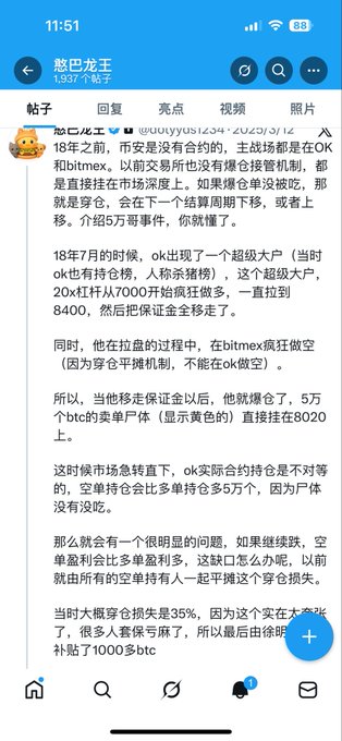 虽然我经常喷 @okx 和 @star_okx ,但也都是基于事实 看了一下517BTC双方的说法,几个关键点: 1/ 是否是操纵市场? 用户在2018年开出了一张4.5亿美元的多单,当时的深度和交易量来说这个单子肯定是会出问题的。 这个暴露出来当时合约风控是有Bug的,一开始就不应该让用户开出来这么大的单子,触发警报后冻结也合理。 当事人开的是20x杠杆,波动不到5%就爆仓了,【如果没有冻结会自己减仓】的说法我认为是不太成立的 虽然用户不一定有操纵市场的主观目的,但高杠杆+头寸占比过高按照惯例都会被视为操纵风险,最后造成穿仓也客观上导致了系统风险的产生。 OKX用户协议6.2条提到了可关闭、限制、回滚交易。这个协议条款肯定是往有利于OKX的方式写,条款本身可能会有争议,但确实是在条款内行动的。 2/ 冻结517BTC是否合理? 从公告看,当时巨额合约是穿仓了的,OKX拿出来2500BTC 填窟窿,另外还用社会化补偿的方式扣了一些用户的盈利,再加上冻结当事人的517BTC 所以目测穿仓损失怎么也在4000BTC以上 至于现货余额,在用户协议里面也有说法【所有子账户/钱包通常视为同一用户整体资产。如果合约产生巨额负余额,平台有权跨账户扣划】 这个和冻结一个道理,条款有争议,但确实是按条款办事。 总的来说,当时OKX的合约风控有很严重的问题,不限制用户开仓规模和杠杆,只有少量保险基金+社会化分摊(同期BitMex已经用ADL了),造成重大系统损失之后,自己赔了一部分,盈利用户那里追了一部分,再把穿仓用户冻了517个BTC。 条款有点流氓,但是都是基于用户协议采取的正常流程,基本无解,只能通过法律渠道解决