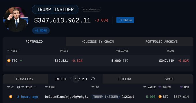 5. 比特币鲸鱼Garrett Jin 昨天两小时内向Binance存入5000枚BTC(价值3.51亿美元)。