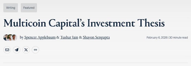 Multicoin的投资理念已更新,并公布了八大投资主题。 1. 金融科技 4.0 • 专注于稳定币的专业金融科技,具有更优的单位经济效益和更低的成本 • 涵盖大部分金融科技技术堆叠(例如 Altitude) • 为全球用户/企业提供稳定币服务的公司(例如 El Dorade) 2. 去中心化金融 (DeFi) • 面向消费者的前端(例如 Phantom、Fuse Wallet、Robinhood) • 以 DeFi 为基础的公司股权(例如 Coinbase、Morpho) • DeFi 中介软体(例如 Kamino、Drift、Aave、Ethena) 3. 金融全球化 • 流动性市场代币化(例如,Paxos) • 合成衍生性商品的全球可近性(例如,Drift、Hyperliquid、Lighter) • 黑市私有化和效率提升(例如,BAXUS、Triumph) • 新兴市场(例如,Kalshi、Sway) • 链上微结构(例如,DFlow、Jito、FastLane) 4. 更有效率的借贷 • Kamino、Aave 5. 娱乐经济 • Cheddr、Novig