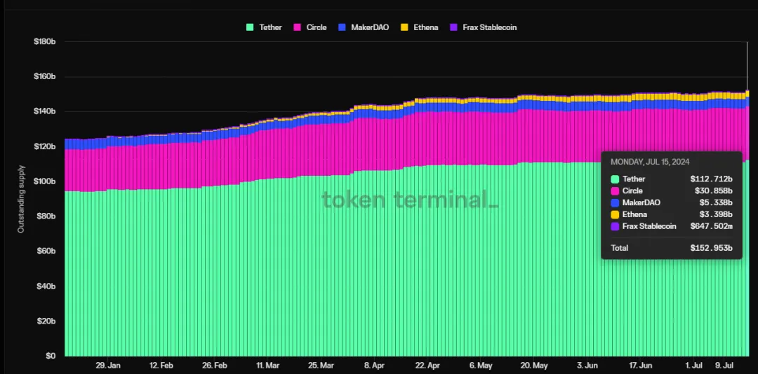 資料顯示,過去四年間,季度穩定幣轉賬量增長了十七倍,從第二季度的 174 億美元增加到 4 兆美元。在 2024 年 7 月 17 日,整個間位貨幣市場的總交易量是 948 億美元,而穩定幣佔整個加密貨幣市場交易量的 91.7%,達到 870 億美元,而其中最大的為 USDT,達到 83.3%。