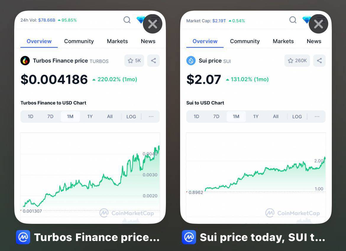 說到 Sui 生態的 Meme 熱潮, Sui 生態老牌 DEX Turbos Finance 必然是這波行情中繞不開的一環。不僅 Sui 生態上的各種 Meme 們表現狂熱, Turbos 的代幣 $TURBOS 同樣有著亮眼的幣價表現,過去一個月漲幅最高達到 240%,市場對於 Turbos 在 Sui 生態中的認可,從直觀的漲幅中得以體現。