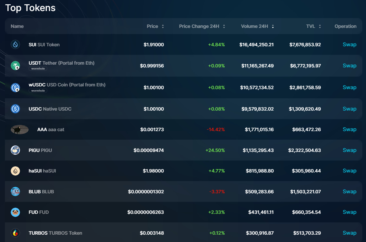 同時,Sui 生態內排名前十的代幣均選擇在 Turbos 上線,無論是 Meme 還是穩定幣,在 Turbos 幾乎是有求必應。