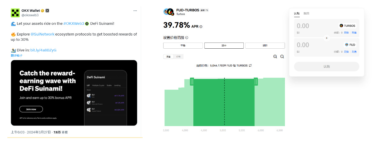 在平臺自流量引導之外,Turbos 還與中心化交易所聯動推出流動性激勵活動,將 Meme 代幣的浪潮和交互體驗延伸至 CEX 用戶。早在今年四月,Turbos 就參與 OKX Wallet 的 DeFi Suinami 活動,通過添加自家代幣 or Memecoin 流動性獲取獎勵。為用戶帶來額外激勵、為合作的 Meme 項目帶來額外的流動性曝光量的同時,還將交易所用戶與豐富的去中心化鏈上世界相連接。
