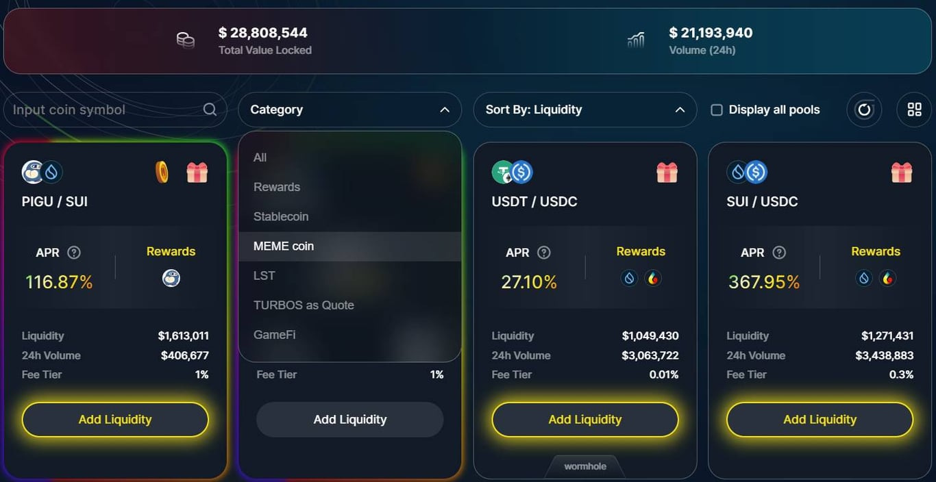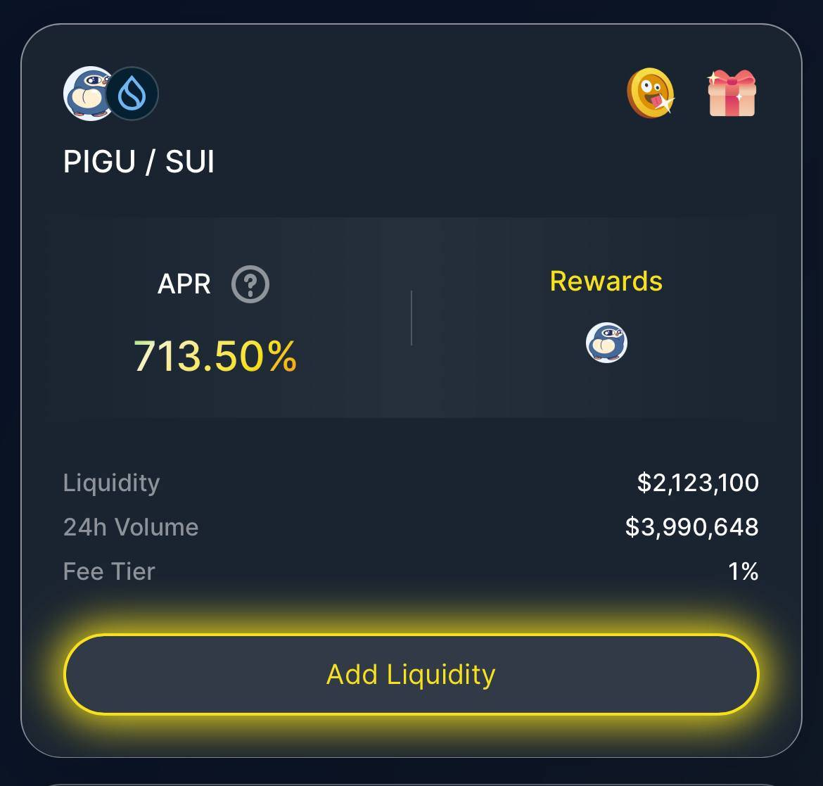 在 Memecoin 的合作上,Turbos 不僅要求數量,更看重質量。$BLUB、$FUD、$PIGU 等 Sui 生態明星 Meme 項目都選擇在 Turbos 獨家首發上線,同時為 Turbos 用戶提供交易獎勵等激勵活動,直接賦能平臺代幣 $TURBOS。例如 10 月 9 日在 Turbos 獨家首發上線流動池的 $PIGU,上線當日成交量達 400 萬美元,同時當日提供年化高達 750% 的額外 $PIGU 流動性激勵。