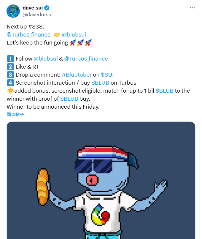 例如近日 Turbos 與 Sui 生態的頭部 Memecoin $BLUB 的聯名激勵活動,用戶通過 Turbos 的智能路由 (Smart Routing) 功能使用 $SUI、$TURBOS 或其他代幣交易 $BLUB 或在 BLUB/SUI 流動性池中提供 LP 即可獲得$BLUB 獎勵。