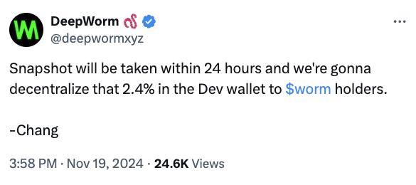 此外,DeepWorm 官方 X 賬號在 Arthur Hayes 喊單後幾分鐘後(11 月 19 日 15:58)發文稱,將把開發者錢包中 2.4% 的代幣發放給 WORM 持有者,快照將在 24 小時內拍攝。