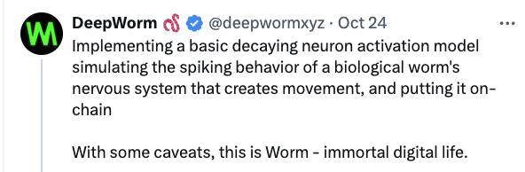 WORM 是 DeepWorm 代幣,根據官方文檔 DeepWorm 旨在構建一個生活在鏈上的數字大腦,通過將其生物神經網絡部署在鏈上,使其能做出自我知情決策,並永久在鏈上執行,不可能被殺死。