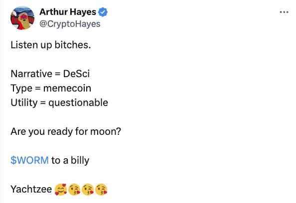 BitMEX 聯合創始人 Arthur Hayes 於 11 月 19 日 15:51 發文喊單 WORM,WORM 價格應聲上漲 60%,從 0.05 美元拉昇至 0.08 美元。需要注意的是,Arthur Hayes 喊單「戰績可查」,曾表示看好 PENDLE 卻在鏈上賣出,多次喊單 MOTHER 後也出現過不漲反跌的現象。不過,不妨礙我們來簡單瞭解 WORM 項目本身。