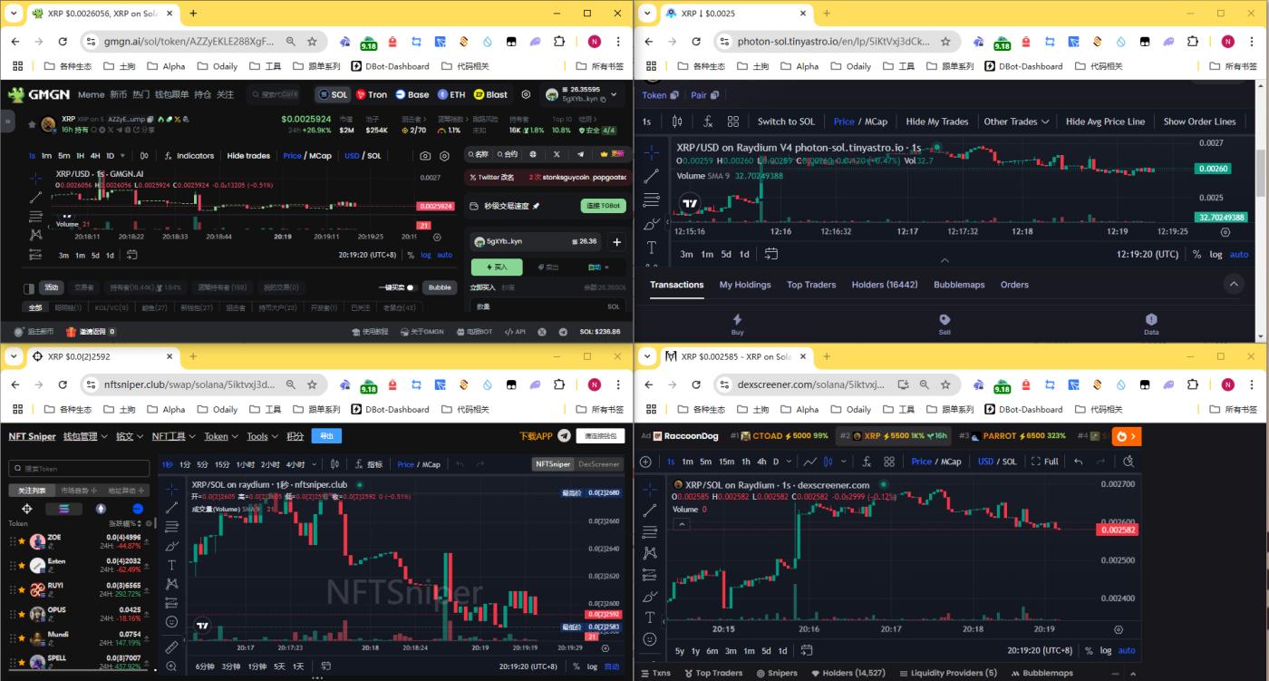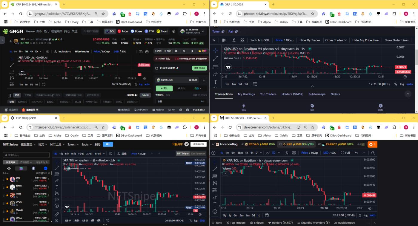 本節選取了 XRP(AZZy……)作為研究對象,基本每一秒都有交易發生。對四個工具 K 線同時截圖如下,第一張圖中可以看到 GMGN 與 abot K 線保持一致,Photon 則相差一秒,Dexscreener 相差了七根 1 秒 K 線。