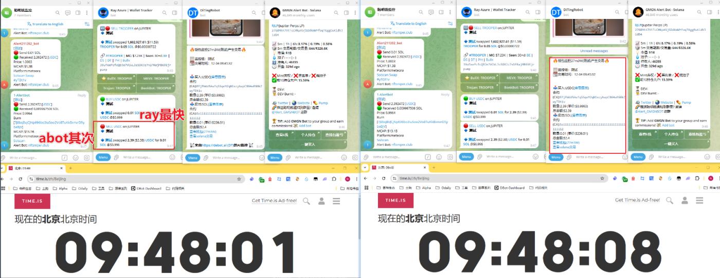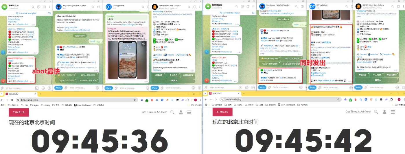 abot 反饋速度最快,其次 Ray 與 Diting 基本同時發出,而後是 GMGN。其中下圖時間受限於作者截圖速度,僅為展示前後順序用,非真實時間差異。