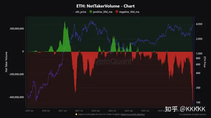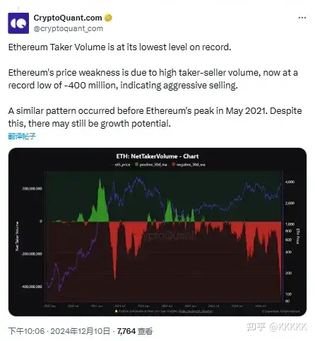 CryptoQuant 報告稱,以太坊的買入賣出量已創下 -4 億的歷史新低。這種激進的拋售活動讓人想起了 2021 年創下歷史新高之前觀察到的模式。雖然當前的拋售壓力可能看起來是利空的,但也可能預示著市場即將達到關鍵的轉折點。