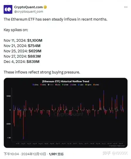 此外,以太坊交易所交易基金 (ETF) 的穩定資金流入成為市場關注的焦點。幾個關鍵日期的流入量尤為顯著,例如 11 月 11 日的 11 億美元和 2024 年 12 月 4 日的 8.39 億美元。這種持續的流入反映了市場對以太坊的濃厚興趣。