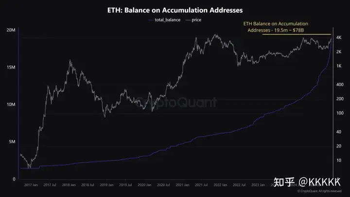 在社交媒體平臺 X 上分享的一系列帖子中,CryptoQuant 分析師剖析了以太坊的關鍵指標。其中一個突出的觀察結果是以太坊的累積地址餘額。這些地址現在持有約 1950 萬 ETH,價值約 780 億美元。