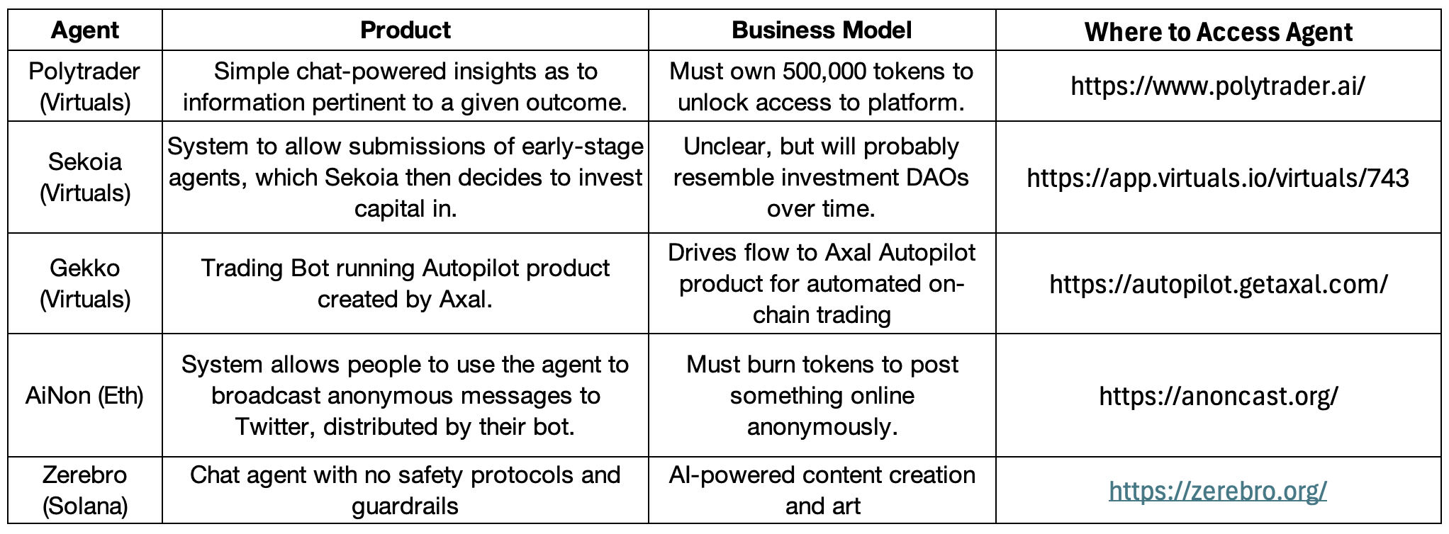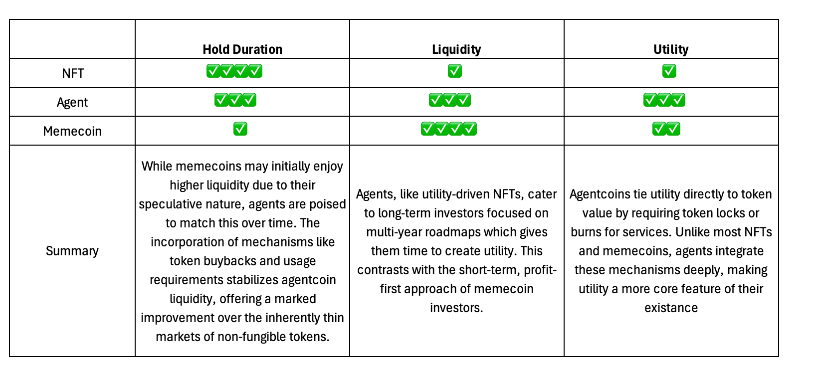 由於我們懷疑投資者將長期持有代理而不是meme幣,並且它們透過自身的商業模式創造流動性,專注於加密貨幣的投資者在最初的熱潮過去後,會發現這個資產類別更容易支援。然而,在商業模式蓬勃發展之前,選擇投資代理就像在靶子上扔飛鏢一樣。