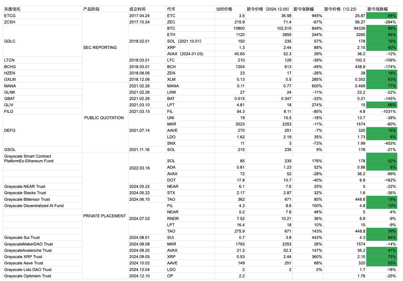 為追蹤灰度基金投資回報率,筆者記錄了灰度基金推出信託時的代幣價格和 12 月 23 日代幣價格,製成以上圖表。從時間來看,灰度推出加密信託產品的時間之前集中在 2018、2021 年,而這時多為牛市階段性高點或後半程。這一現象可能與灰度推出基金需要經過較為漫長的週期和相對成熟的市場有關。而今年 12 月灰度又開始集中推出信託基金,這次是否能打破短期高點的循環。