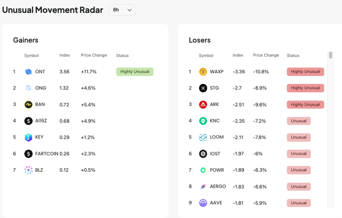 市場行情持續萎靡,資金稀缺與市場情緒數據顯示交易員持續悲觀,在弱勢行情下可以通過異常漲跌雷達來捕捉下跌行情利潤。 根據下圖 Blave 異常漲跌排行,8 小時內表現較弱的前三為 $WAXP $STG $ARK ,其他還有 $KNC $POWR 等等... 通過異常漲跌雷達找弱勢交易機會👇🏻blave.org/studio/en/charts/unu...…
