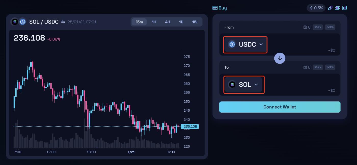 STEP 3. 成功將 USDC 提到 Solana 鏈後,將其兌換成 SOL 即可(演示使用:https://raydium.io/swap/)。