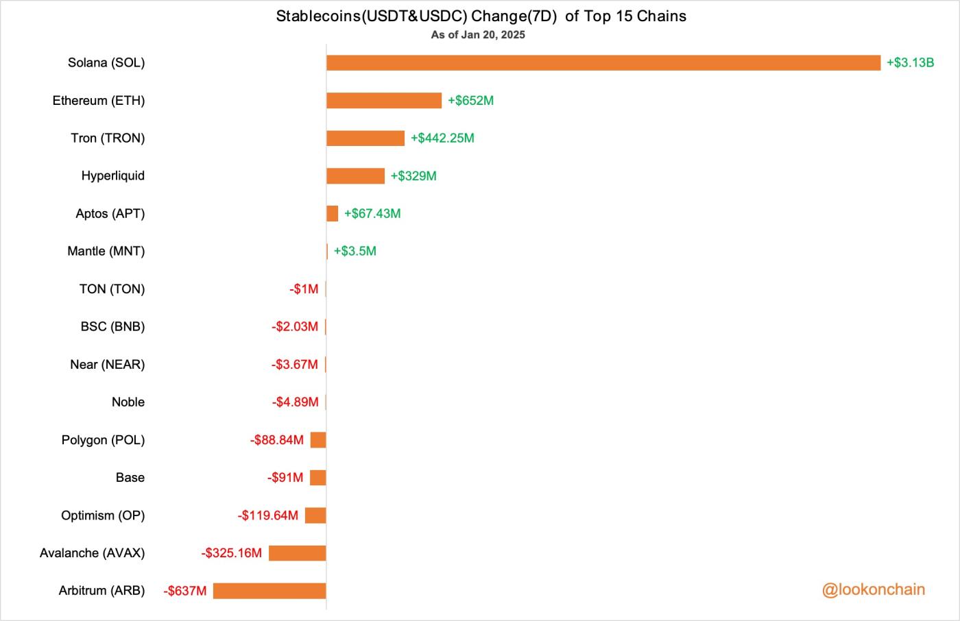 與此同時,據 Lookonchain 監測,過去 7 天內,Solana 上的穩定幣(USDT 和 USDC)的總額增加了 31.3 億美元,顯示出市場對 Solana 生態的持續看好。