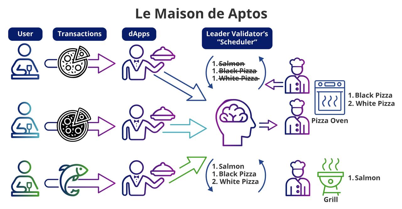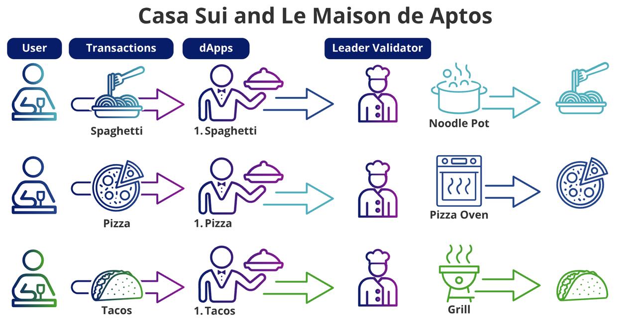在此類比中,Sui 和 Aptos 的技術改進如同優化餐廳運營 —— 加速廚房效率、提升服務員協調性、確保訂單處理精準快速。