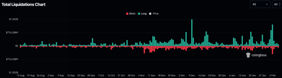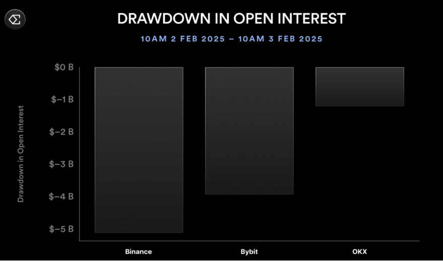 他估計總爆倉金額在80億至100億美元之間。這與各交易所24小時內觀察到的未平倉合約減少量更為相符合,Bybit的未平倉合約總量從2月2日至3日減少了40億美元,而幣安一家則減少了50億美元。