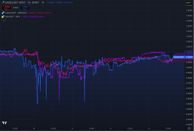 USDe、USDC(紅色)和DAI(紫色)價格對比