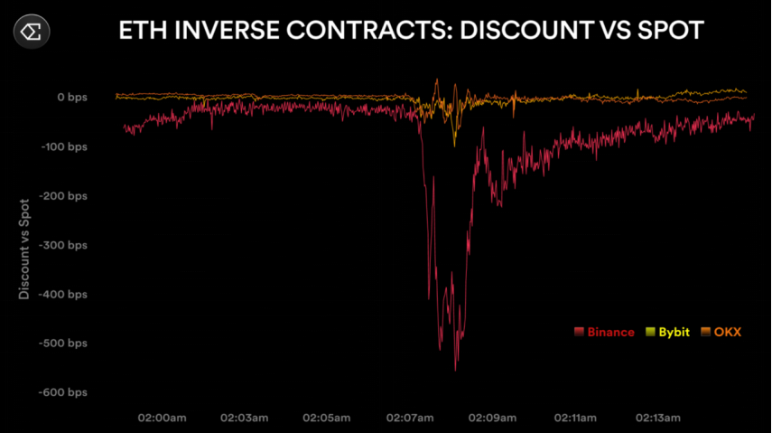 在Bybit和OKX等其他交易所,這種折價幅度並不明顯,ETH合約的折價接近1%。三個交易所的BTC合約表現好於ETH,因為拋售主要集中在ETH合約,特別是幣本位(反向)合約上。