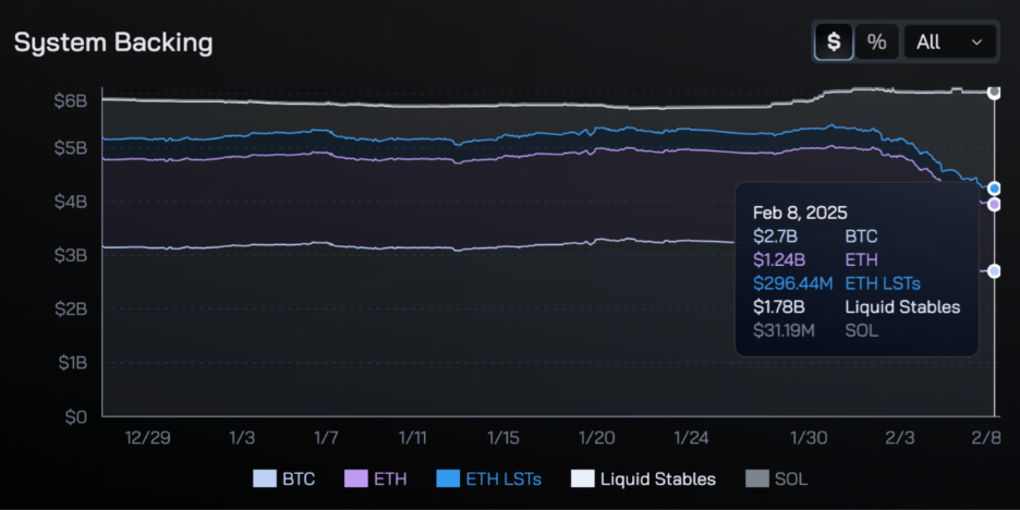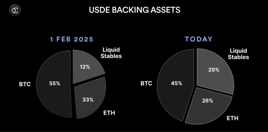 Ethena動態的資產配置方法體現在以下2月初與今天的擔保資產對比中。USDe現在由近18億美元的流動性穩定幣擔保,佔擔保資產的29%,其中一些穩定幣的收益率高於永續合約的資金費率。只要這些永續合約表現不夠好,Ethena就會繼續配置到流動性穩定幣,並優化支持USDe的資產。