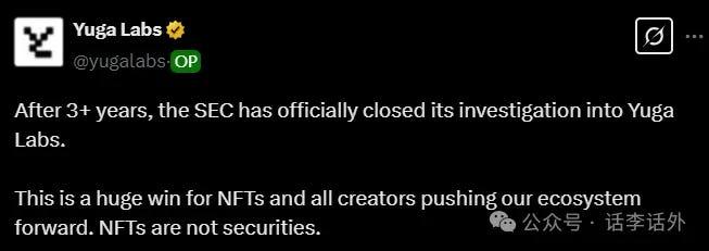 3 月 4 號的時候,Yuga Labs 發佈公告稱,經過 3 年多的時間,SEC 正式結束了對他們的調查(SEC 於 2022 年 10 月對 Yuga Labs 違反證券法進行了訴訟),這對 NFT 來說是一個巨大的勝利,NFT 不是證券。如下圖所示。
