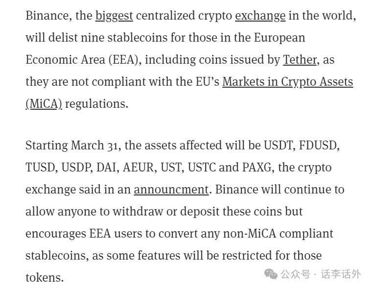 為了符合 MiCA 法規,Binance 將於 3 月 31 日為 EEA(歐洲經濟區)用戶下架不符合 MiCA 標準的穩定幣,包括 USDT、TUSD、DAI 等 9 種穩定幣。
