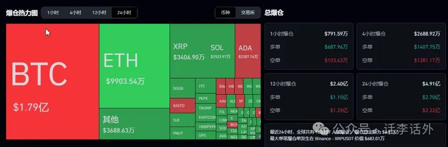 回到加密市場。我們再看看清算方面的數據,僅過去的 24 小時,又有超過 16 萬人爆倉,爆倉總額為 4.91 億美元,其中多單爆倉 2.7 億美元、空單爆倉為 2.2 億美元。如下圖所示。