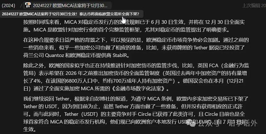 關於 MiCA 法案的事情我們在去年的幾篇文章中已經有過一些介紹和說明,比如 2024 年 12 月 27 日的文章,感興趣的夥伴可以回看歷史文章,如下圖所示。